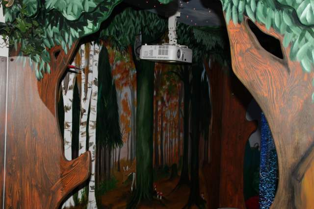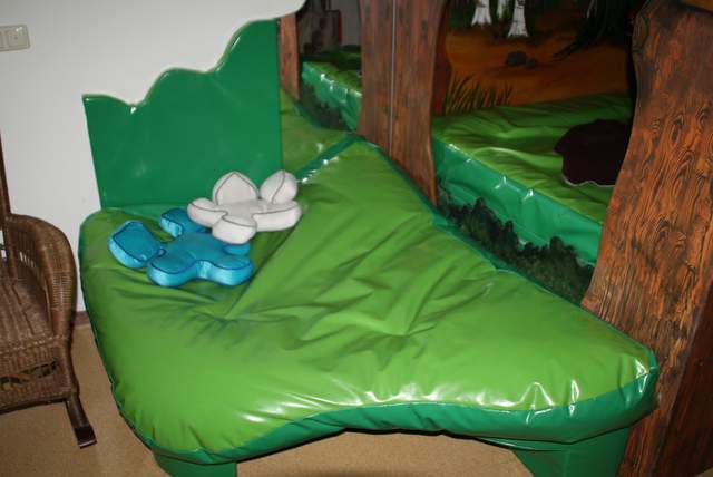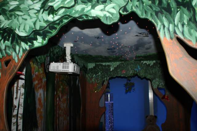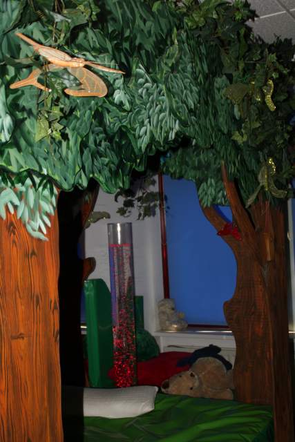Wij werden vriendelijk ontvangen door Elize en Nienke en enkele clienten. De snoezelruimte is ingericht in het thema bos, dit is terug te vinden in de ombouw van het waterbed en ook de muur wordt door bomen en bladeren versierd. In het plafond boven het bed branden allemaal kleine lichtjes en een beamer zorgt voor mooie projectie Blacklight licht en een blacklight aquarium geven een andere visuele prikkel De ruimte wordt volgens Elize veel in de middaguren gebruikt als ontspanning