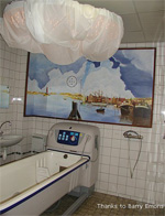 Het water is aangenaam warm en als de bewoner het als prettig ervaren , gebruiken we de hydrosound (zo wordt het gevoel geprikkeld). Om het zien te prikkelen, is de badkamer tropisch gedecoreerd met een palmboom, inktvis , dolfijn, zeesterren, wolken en vogels.