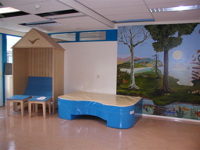 Aan de andere kant van de ruimte staat een houten hoekkast met enkele onduidelijke attributen achter plexiglas. Het is, zo wordt me verteld “De Snoezelkamer”